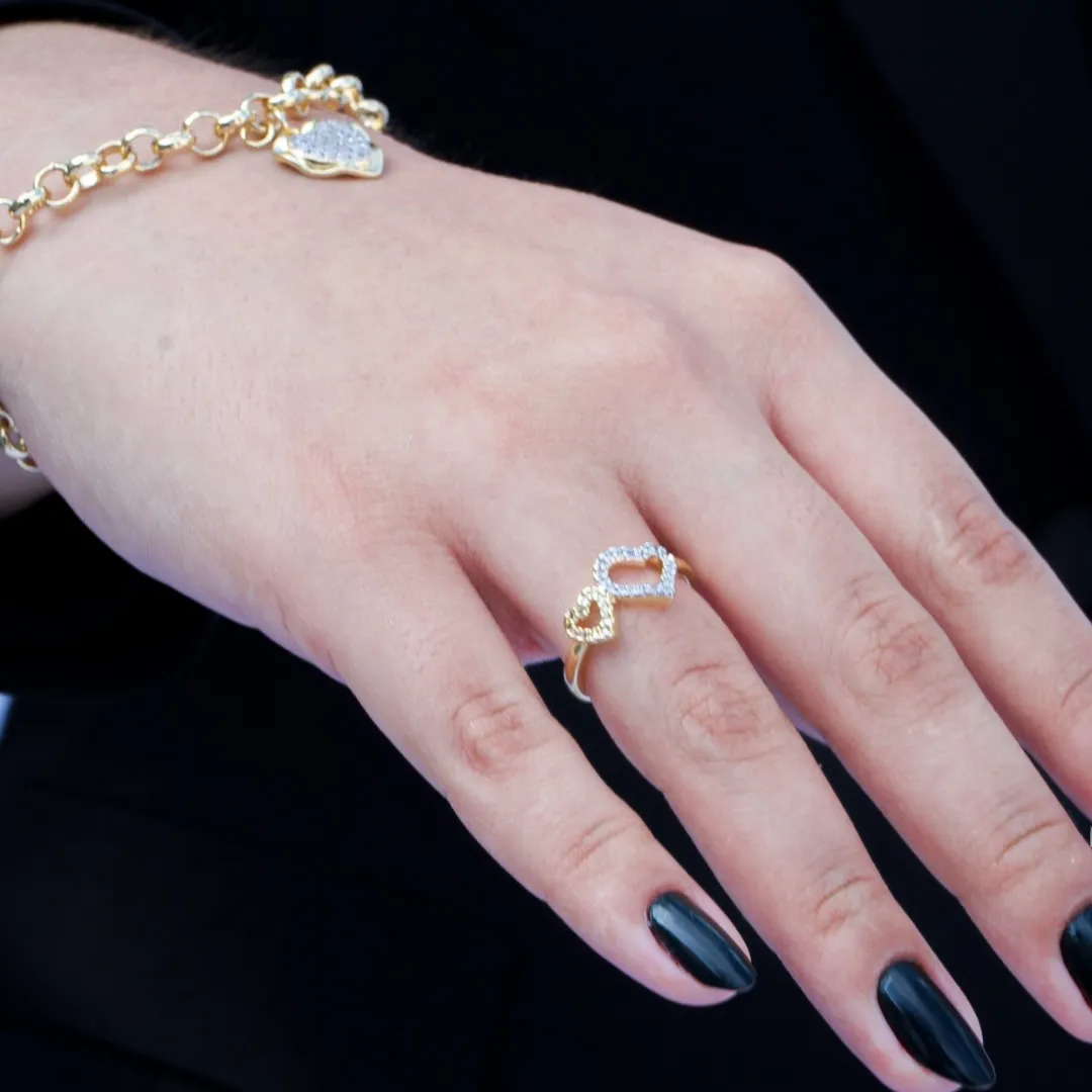 ANEL COM CORAÇÃO DUPLO VAZADO E MICRO ZIRCONIA CRISTAL COM APLICAÇÃO DE RODIO BRANCO Nº 19- BANHADO A OURO 18KConfira opiniões e avaliações de clientes!